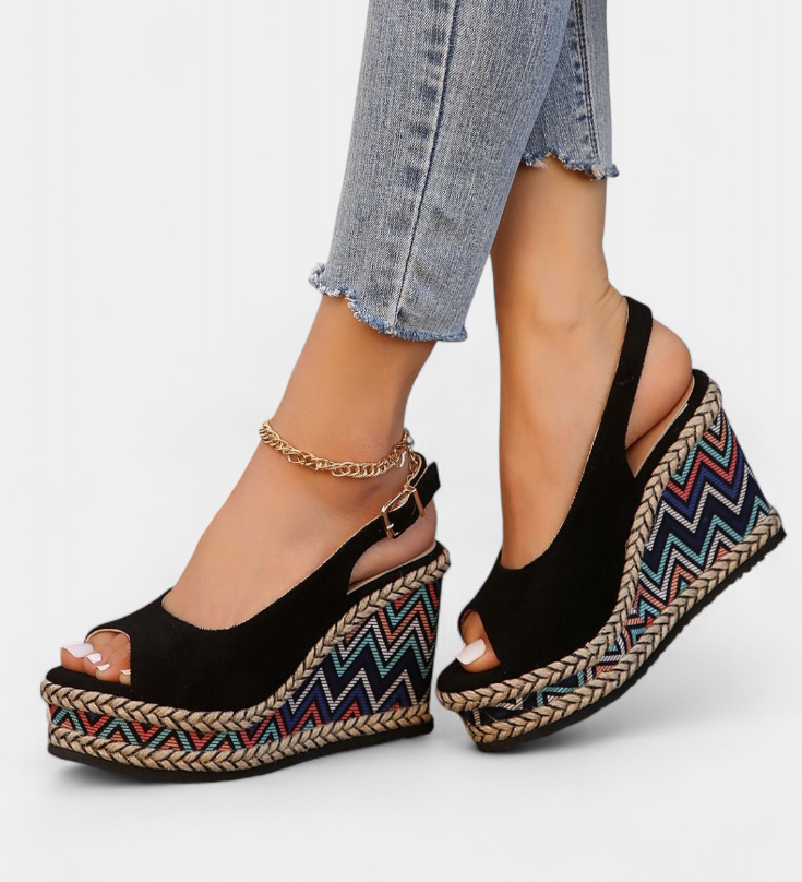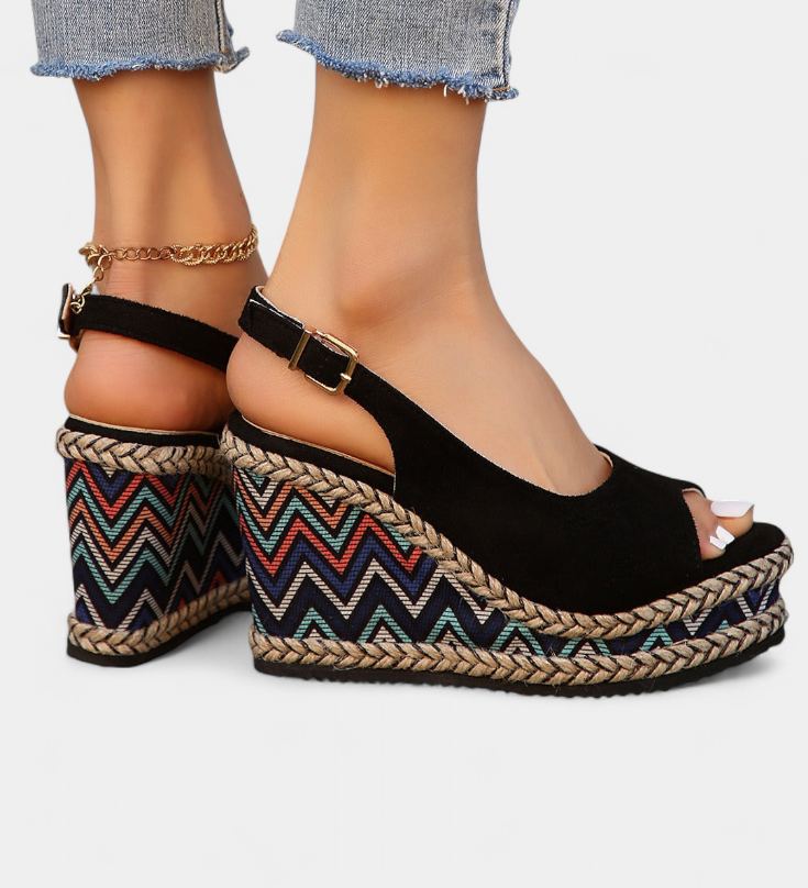Dionisia Sandalias de Cuña con Estampado Étnico y Elegantes Correas de Ante
