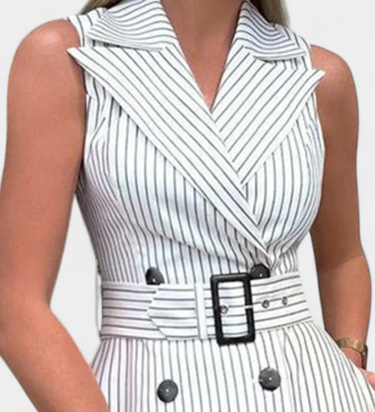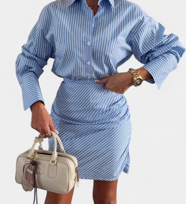 Cynthia Vestido Camisero Mini a Rayas con Elegantes Pliegues y Detalles de Botones
