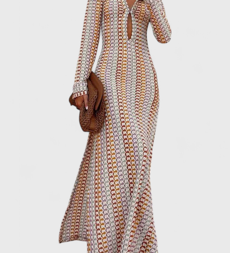 Crisanta Vestido Largo Estampado con Ondas Multicolores y Manga Larga - Elegancia y Estilo en Cada Paso