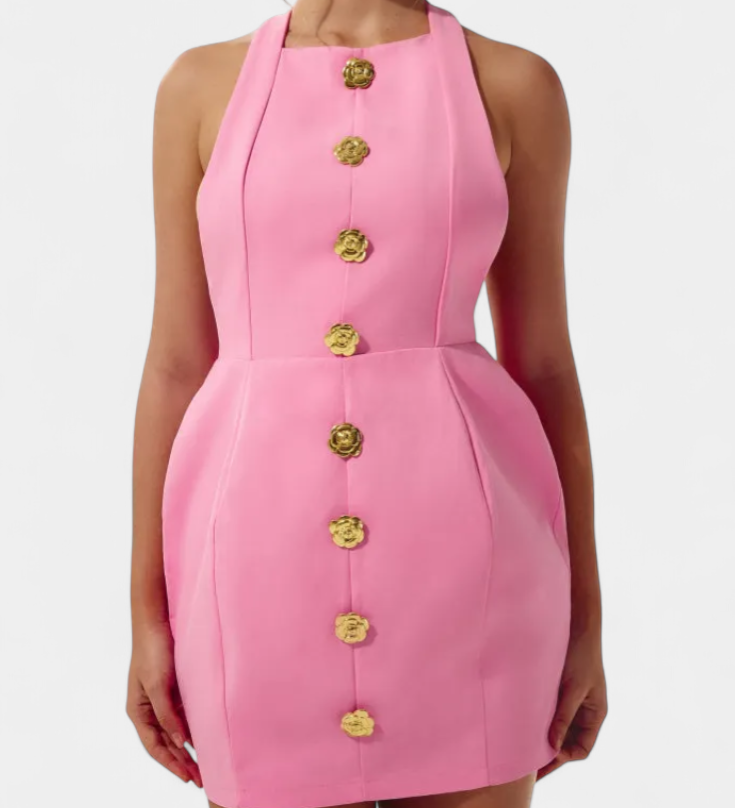 Yvonne Vestido Mini Halter con Escote en V, Espalda Abierta y Encantador Detalle Floral