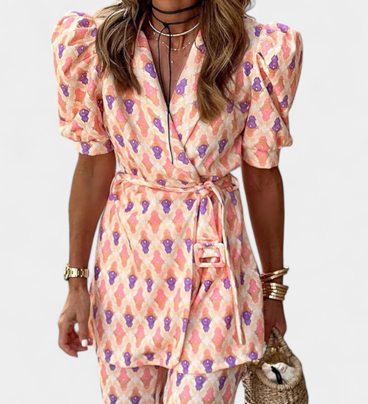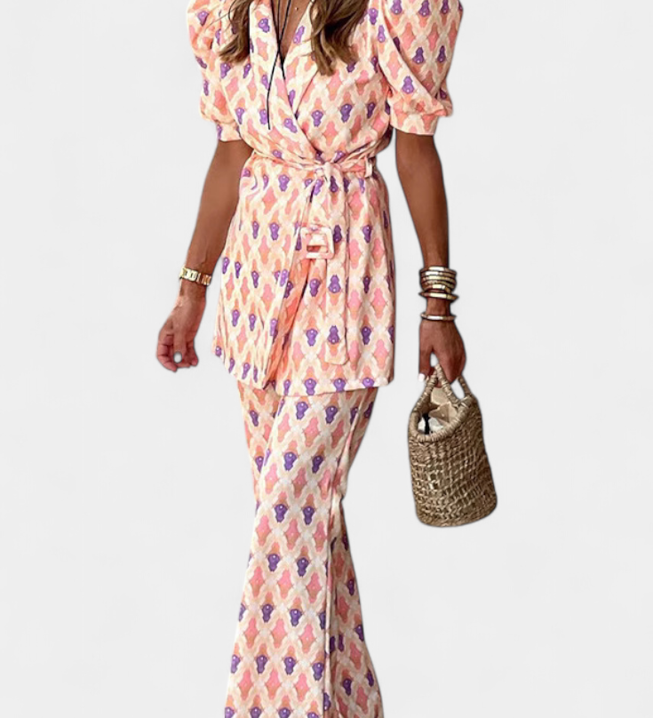 Conjunto Araceli de estampado vibrante con blazer y pantalón campana para un estilo sofisticado y a la moda