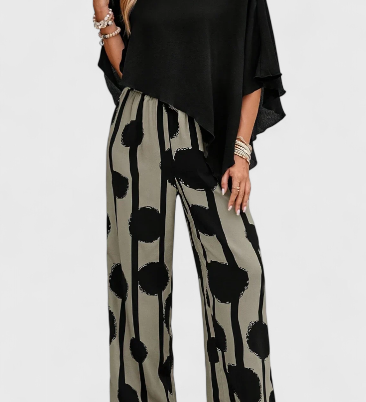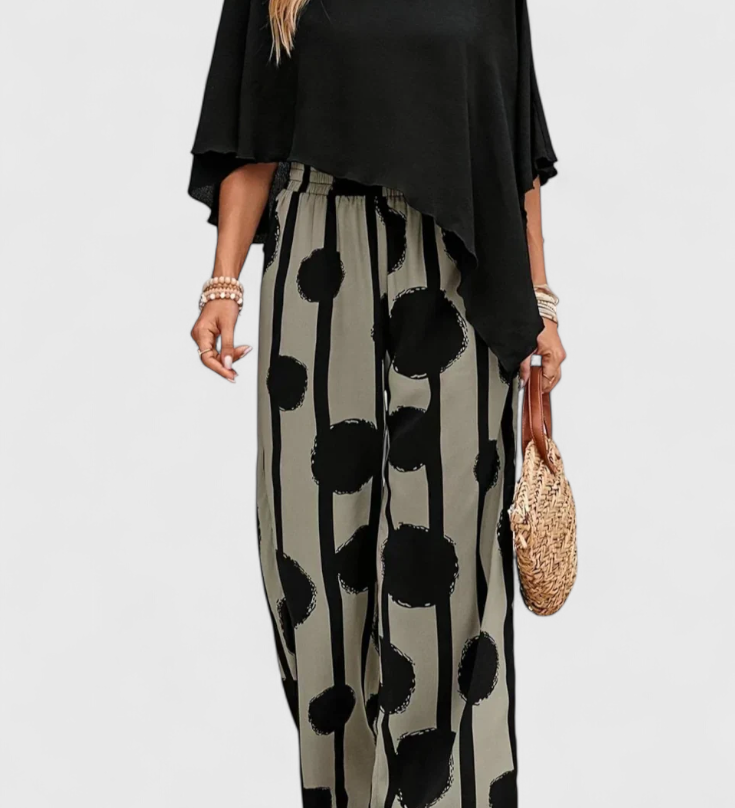 Conjunto Asimétrico Aleida con Top Moderno y Pantalón Estampado Elegante