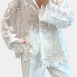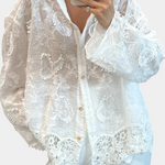 Delicada, atemporal y llena de encanto — la Blusa Wild Iris es tu prenda ideal para una elegancia bohemia sin esfuerzo. Con su suave tono blanco y bordado intrincado, aporta un toque elegante a cualquier atuendo. Los acabados de encaje en las mangas y el dobladillo añaden un toque romántico, mientras que la silueta relajada y abotonada garantiza comodidad y facilidad de estilo.