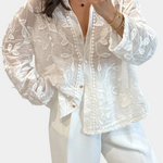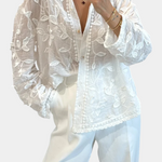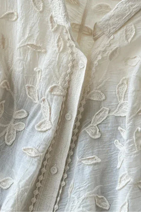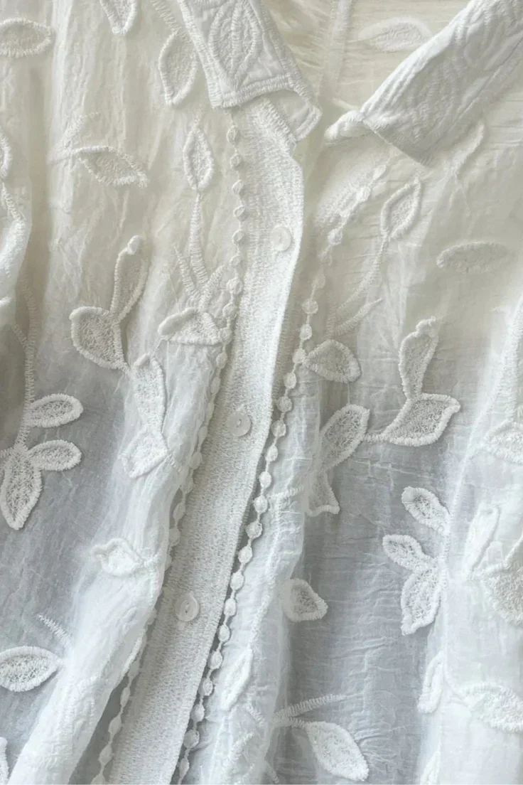 Ligera, elegante y llena de encanto poético—la Camisa Prairie combina encaje transparente con delicados bordados de hojas para un look que se siente tanto atemporal como único. Terminada con sutiles botones en tono dorado, es una declaración de suave sofisticación—perfecta para un estilo en capas de día a noche.