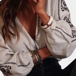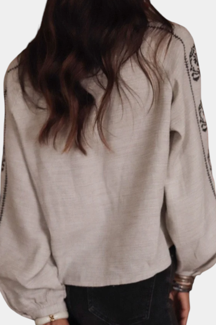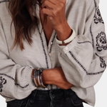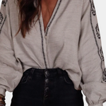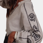 Eleva tu look diario con el Top Amara – una blusa suave de mezcla de lino adornada con bordados de estilo artesanal y mangas vaporosas. Chic sin esfuerzo con un alma vintage, es tu nueva opción para ese encanto bohemio relajado.