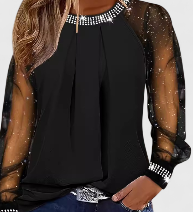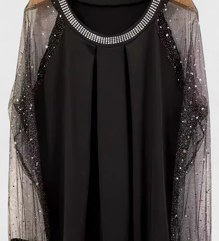 Flor Blusa Elegante con Mangas de Tul y Detalles de Strass para un Look sofisticado