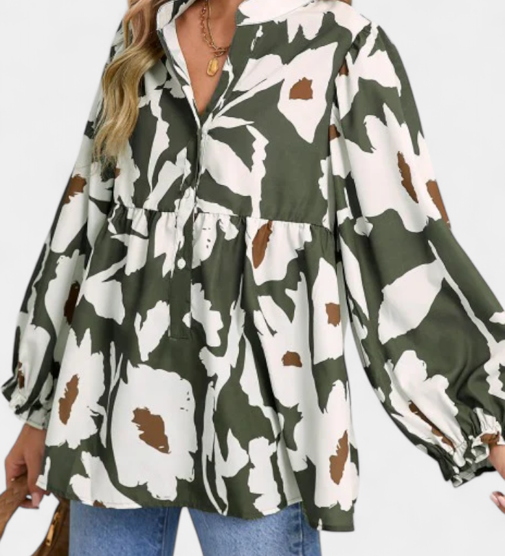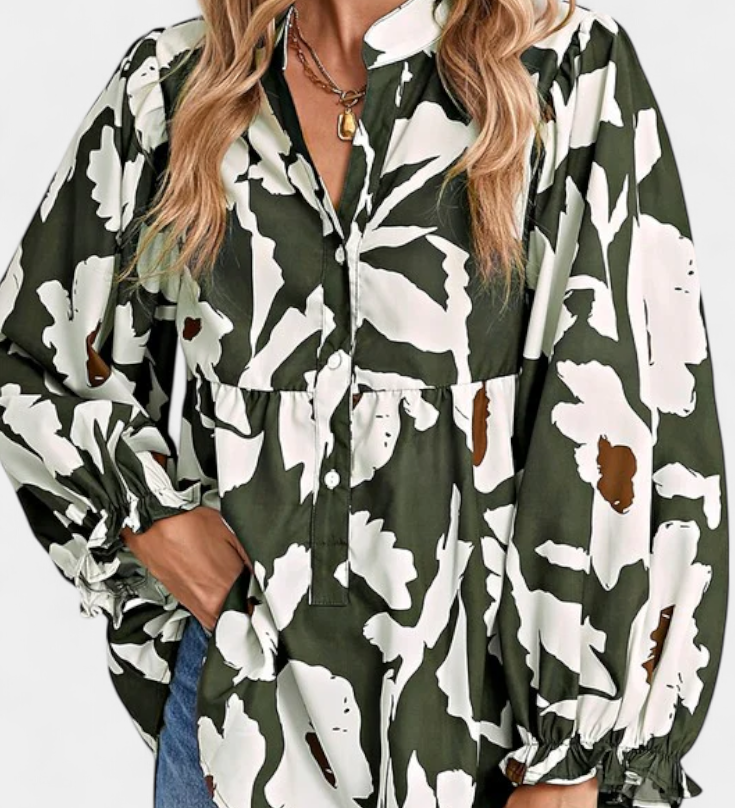 Filomena Blusa Elegante con Media Botonadura y Manga Abullonada en Estampado Floral Abstracto