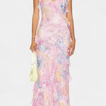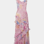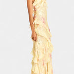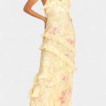 Elegante Vestido Maxi con Volantes Florales y Atuendo Fawn