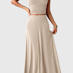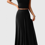 Impactante sin esfuerzo, el Conjunto Anastasia combina un elegante top corto fruncido y una falda fluida de largo completo para un look que es tan seguro como cómodo. Diseñado para moverse contigo y elevar tu día a día, es un estilo al que seguirás recurriendo.