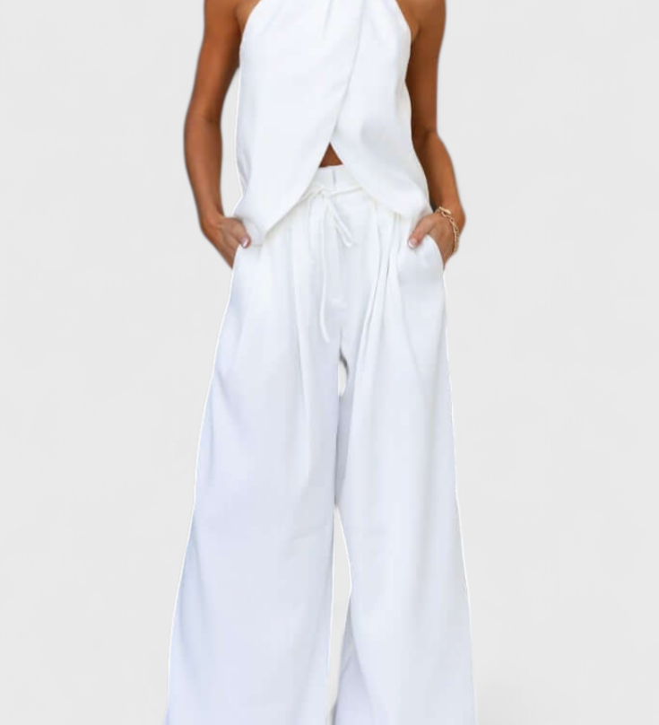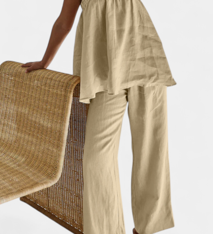 Elegante Conjunto de Lino Bernadina con Top de Abertura Frontal y Pantalón de Pierna Ancha para un Look Sofisticado