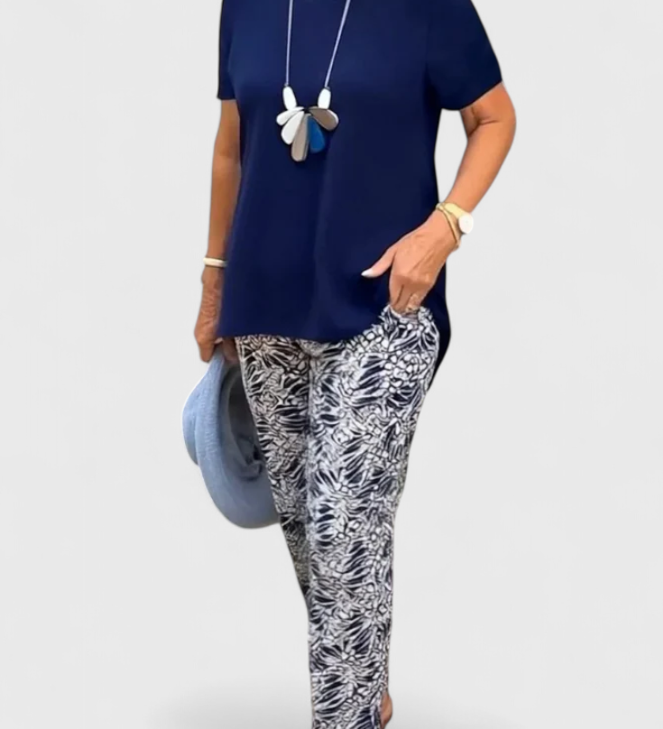 Conjunto Asimétrico Aleida con Top Moderno y Pantalón Estampado Elegante