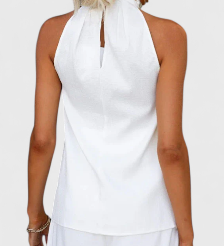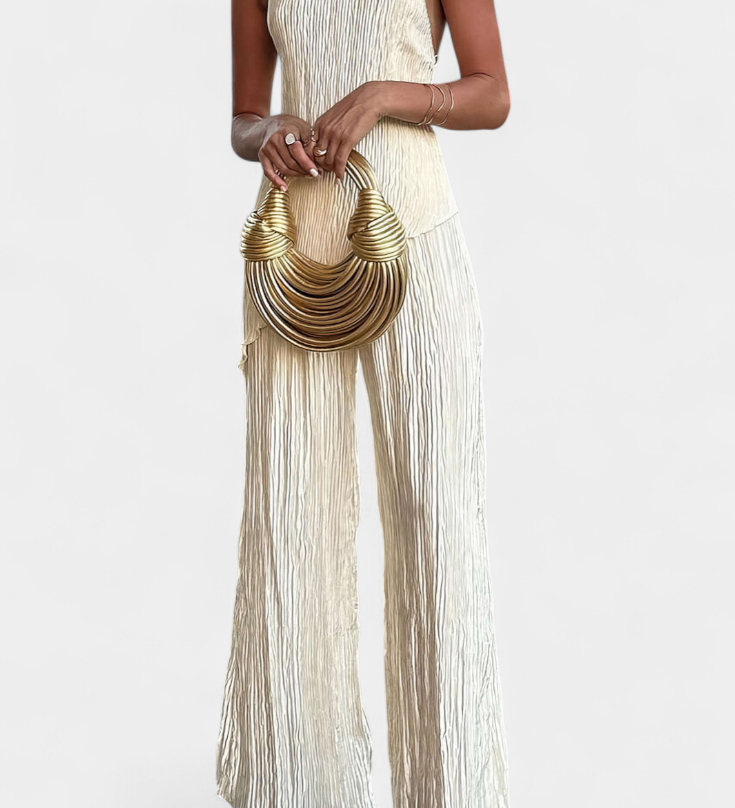 Elegante conjunto plisado con top halter asimétrico y pantalón fluido para un estilo sofisticado