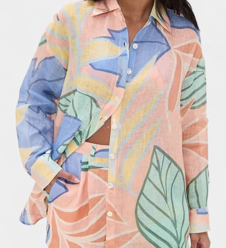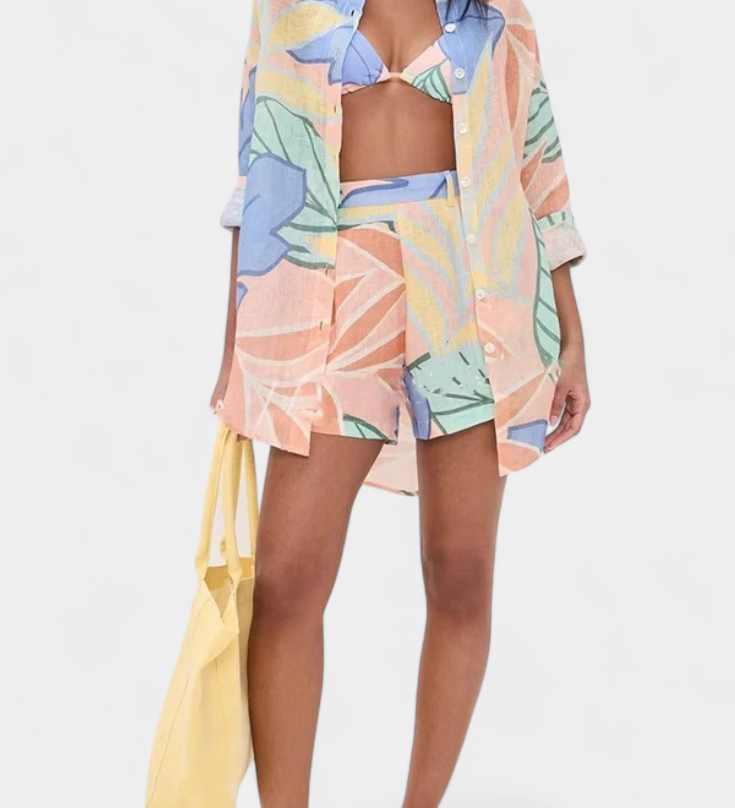 Lumina Conjunto Tropical Elegante con Camisa Suelta y Shorts de Cintura Alta