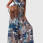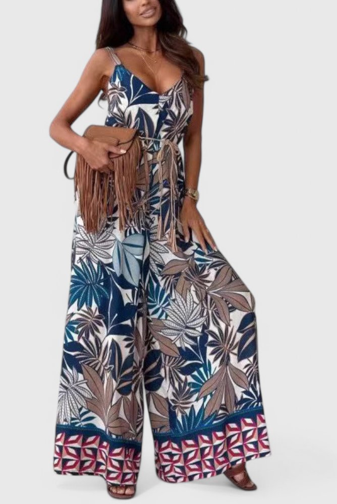 Haz una entrada impactante con Gabriella: un mono fluido de pierna ancha diseñado para captar la atención. Con su favorecedor escote en V, delicados tirantes de espagueti y cinturón que define la cintura, este look combina un estampado audaz con una sofisticación sin esfuerzo. Ideal para escapadas soleadas o planes nocturnos elegantes.