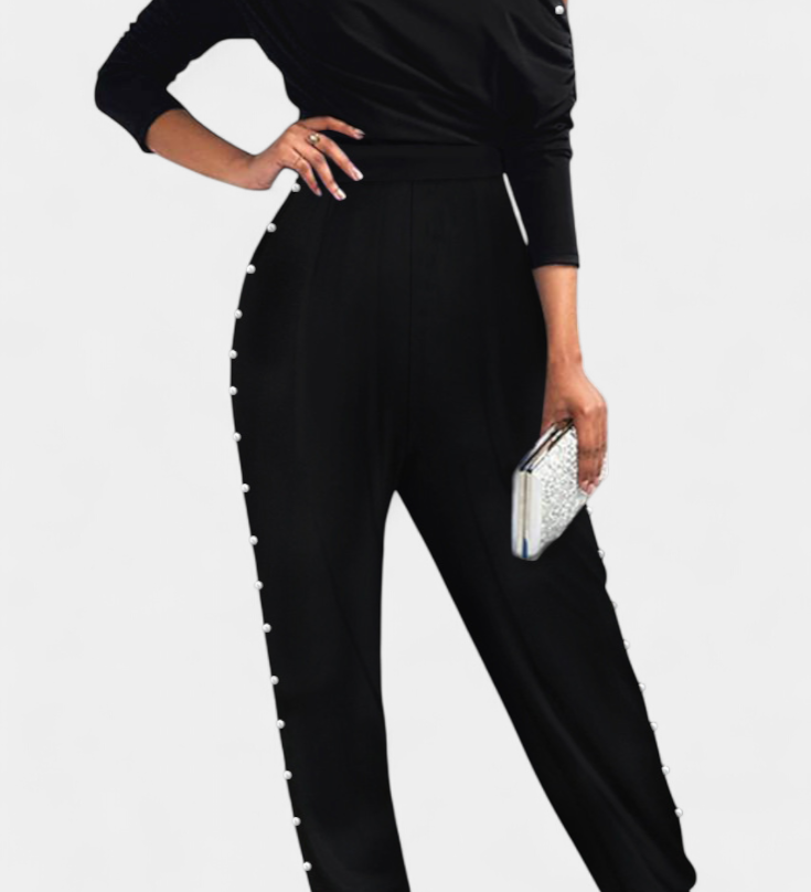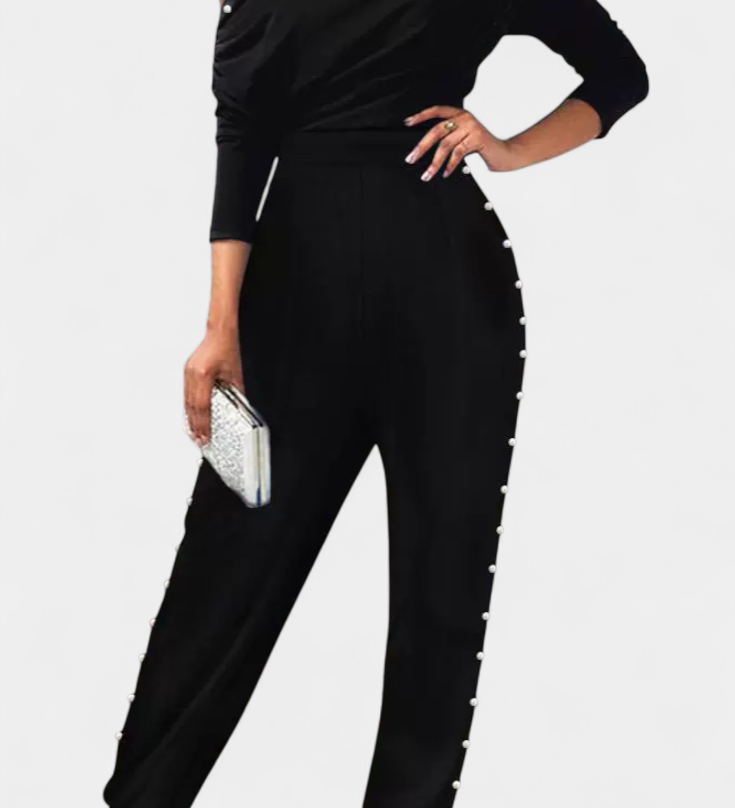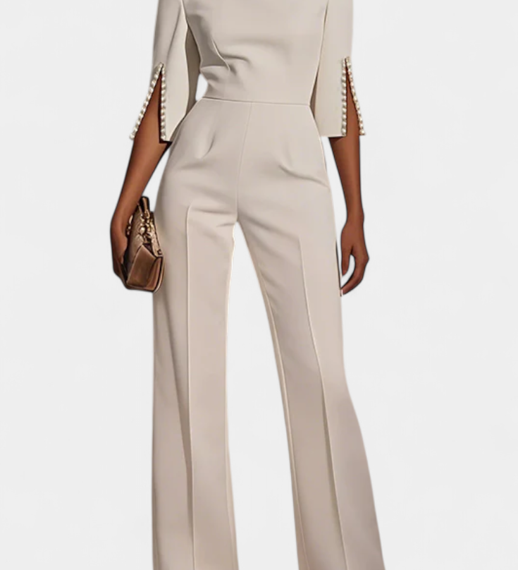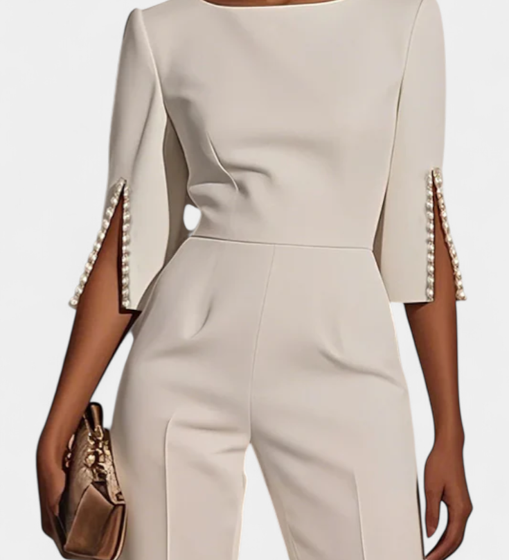 Brina Mono Elegante con Hombro Descubierto y Encantadores Detalles de Perlas