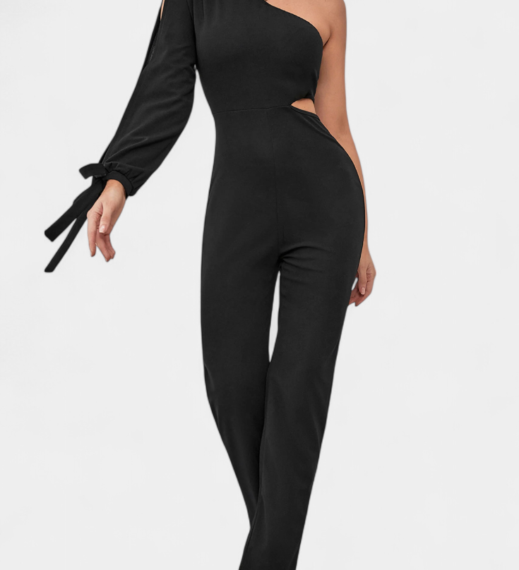 Elegante vestido mono asimétrico Sahar con corte en el bícleo, manga larga y detalle anudado