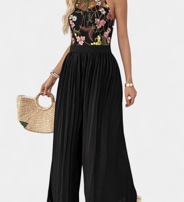 Elegante Palazzo Maruja Mono con Bordado Floral y Encaje Transparente para un Look Sofisticado