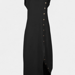 El vestido Aphrodite fusiona diseño arquitectónico con feminidad contemporánea. Su corte asimétrico crea una silueta moderna, mientras los botones dorados añaden un acento lujoso que capta la mirada. El tejido ligero y estructurado permite movimiento sin perder elegancia.