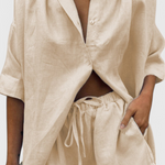 Disfruta de los días de verano con un estilo sin esfuerzo con el Conjunto Anika. Con una camisa de botones relajada y pantalones cortos con cuerda ligeros, esta combinación de dos piezas sin arrugas aporta comodidad y facilidad a cada salida casual. Hecho de una mezcla de algodón ligero, es perfecto para paseos en clima cálido, escapadas de fin de semana o tardes relajadas.