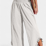 Relajado, fresco y con mucho estilo. El pantalón Justina combina una silueta ancha con un tejido de algodón-lino ligero, ideal para climas cálidos. Su cinturilla fruncida de talle alto estiliza la figura mientras que los volantes en el bajo añaden un detalle femenino y encantador. Una prenda versátil para looks de playa, escapadas o días de verano sin esfuerzo.