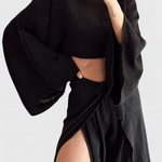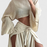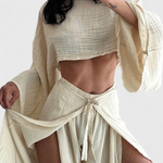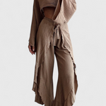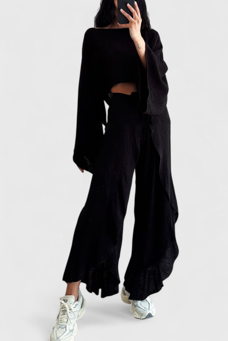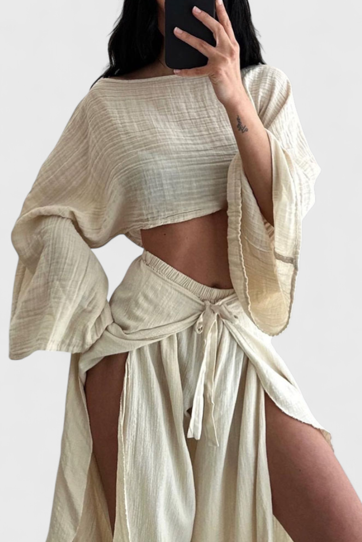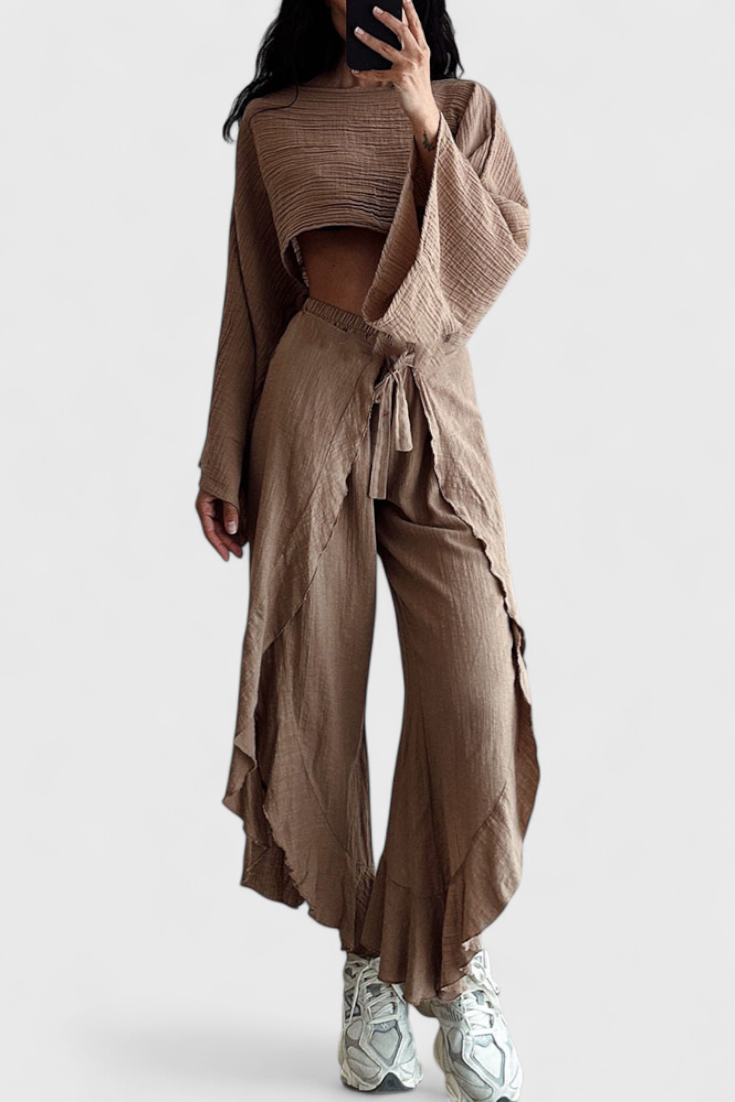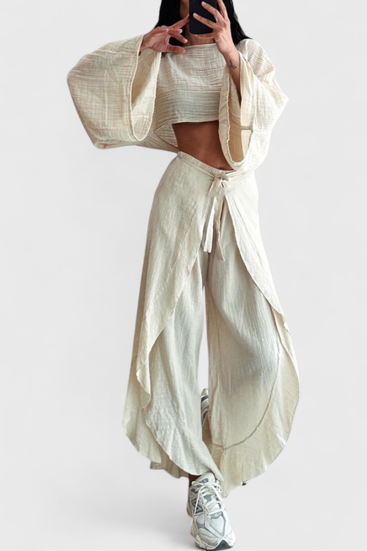 Comodidad con un toque audaz. El conjunto Maeva combina un top corto de manga suelta con abertura lateral y un pantalón fluido de talle alto con lazo en la cintura, ofreciendo una silueta moderna y versátil. Su tejido ligero y caída suave lo convierte en la elección ideal para días relajados con estilo.