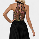 • Parte superior tipo halter con encaje floral semitransparente que realza el torso