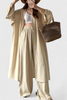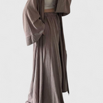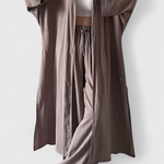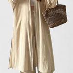 Minimalismo relajado con un toque moderno. El conjunto Suella fusiona elegancia discreta y funcionalidad con un cárdigan largo de caída fluida y pantalones a juego de cintura alta. Su abertura lateral aporta movimiento sutil, mientras que la mezcla de algodón y lino garantiza frescura durante toda la temporada.