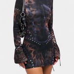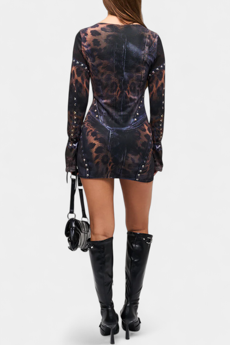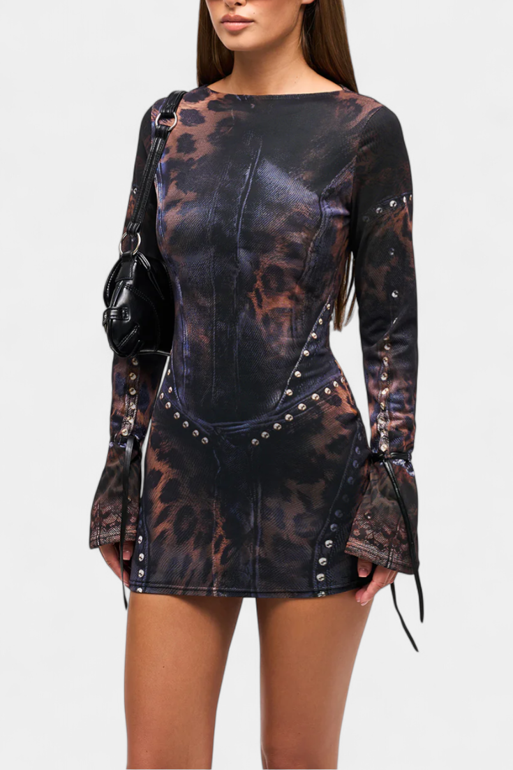Atrevido y sofisticado, el vestido Tabea combina un ajuste ceñido con detalles artísticos para un look que no pasa desapercibido. Su estampado de ilusión, diseñado internamente, se une a mangas acampanadas de caída completa y delicados lazos de cuero sintético en las muñecas para un acabado distintivo. Una pieza pensada para resaltar la silueta con elegancia y carácter.